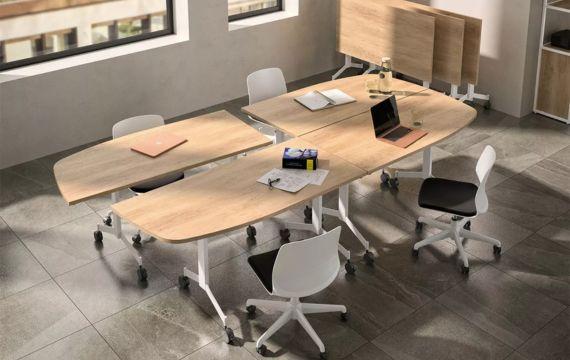 Tables modulables ou fixes avec passe-câbles pour les réunions de travail.