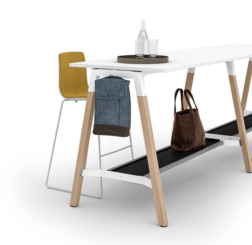 Réalisés en aggloméré de 25 mm d’épaisseur revêtu de papier peint imprégné de résines mélaminiques (densité 650Kg/mc. E1, CARB PH 2/TSCA Titre VI. Panneaux à faible émission de formaldéhyde, moins de 50% de la classe E1, selon les normes UNI EN. Classe de réaction au feu Ds2, d0 – Dfl-S1) bordés d’un chant arrondi en abs massif de 2 mm d’épaisseur. Les plateaux en mélaminé sont accrochés à la structure en plusieurs points, à la traverse avec des clips en nylon, au piètement à la structure en portique avec des étriers. Il est possible d’insérer dans les plateaux, en perforant au préalable, des accessoires (en option) pour le passage des câbles électriques.
