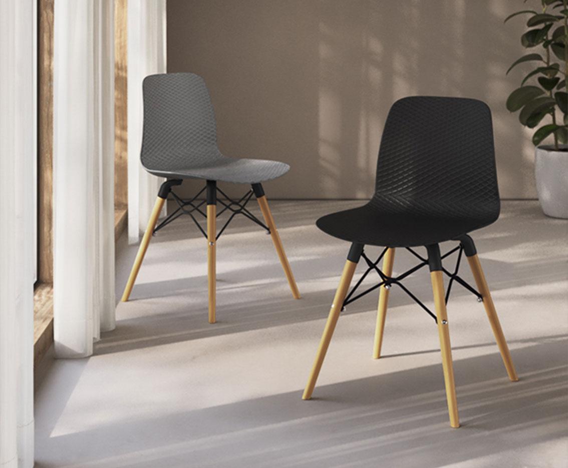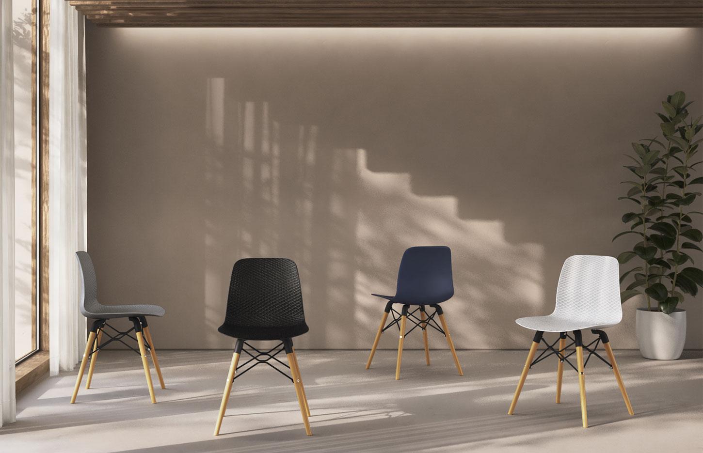 Chaises Monocoque en polypropylène. Piétement bois naturel et acier. Coloris disponibles : Noir, Blanc, Gris et Bleu marine. Vendu par lot de 4 uniquement.