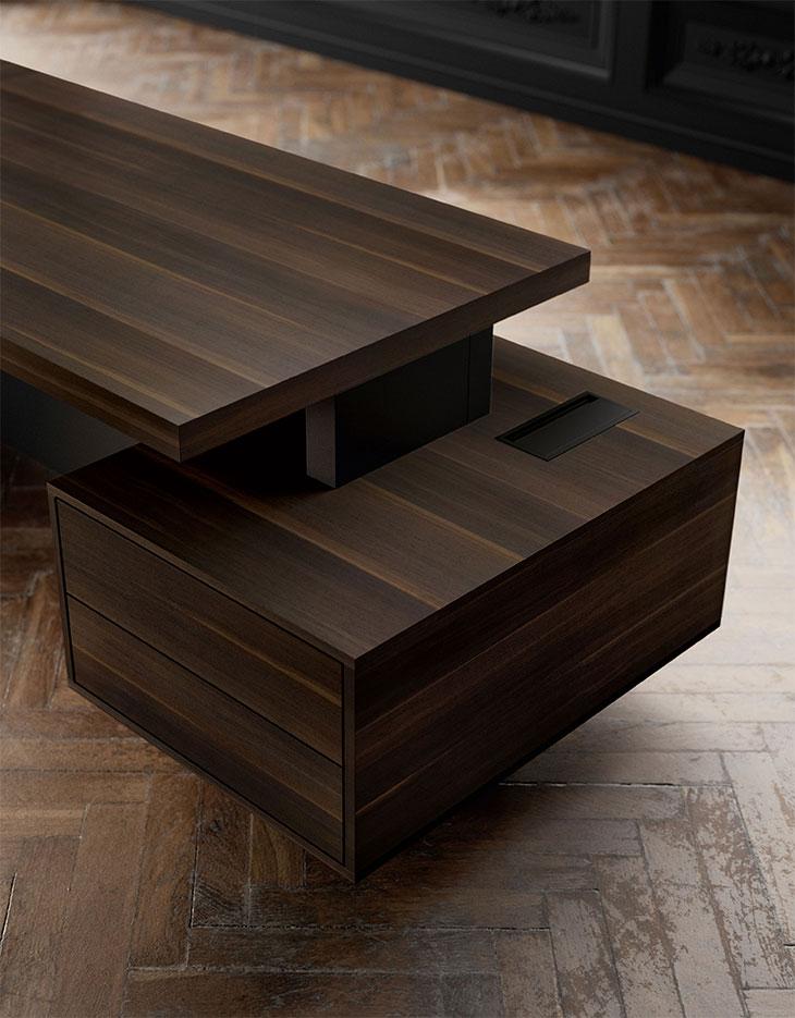 Tiroir réalisé avec des profilés recouverts de pvc noir et fond en mdf ép.3mm. Système d’ouverture avec extension sur coulisses de type QUADRO escamotables avec mécanisme Push&pull. Les façades des tiroirs peuvent être disponibles en 4 finitions mélaminé et 10 finitions laqué mat anti-rayures. La profondeur du caisson est égale à la profondeur du plateau du bureau et est équipé d’un compartiment interne utilisé pour le câblage électrique.