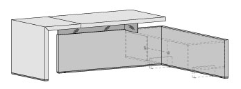 La partie terminale du plateau et le panneau latéral sont bordés et reliés par usinage à 45° avec joint soigné. Le panneau latéral et la première portion du plateau présentent des veinures par opposition à l’élément longitudinal du plateau. Le panneau latéral est équipé d’un socle en finition métallique H.18mm avec patins de nivellement.