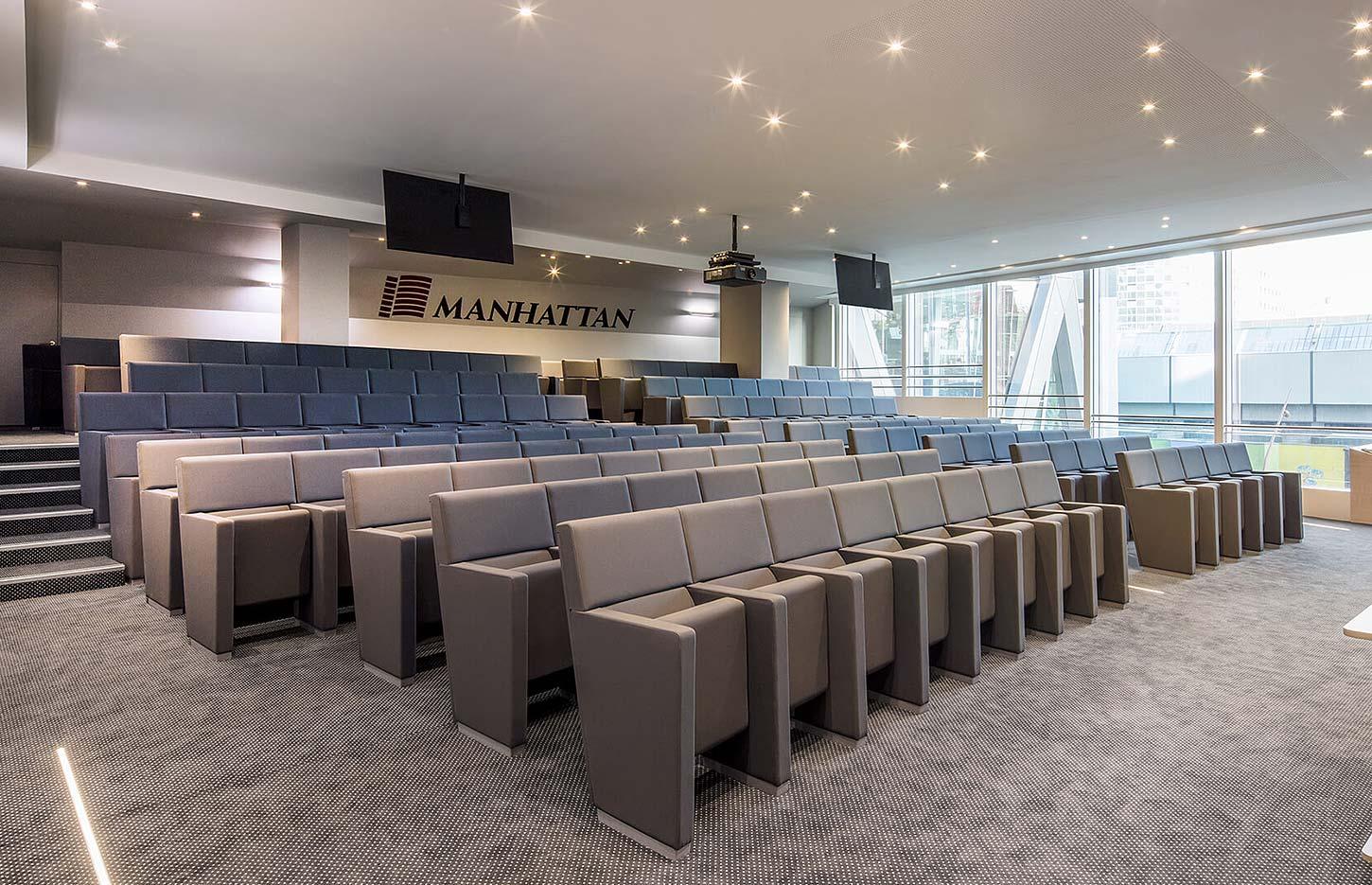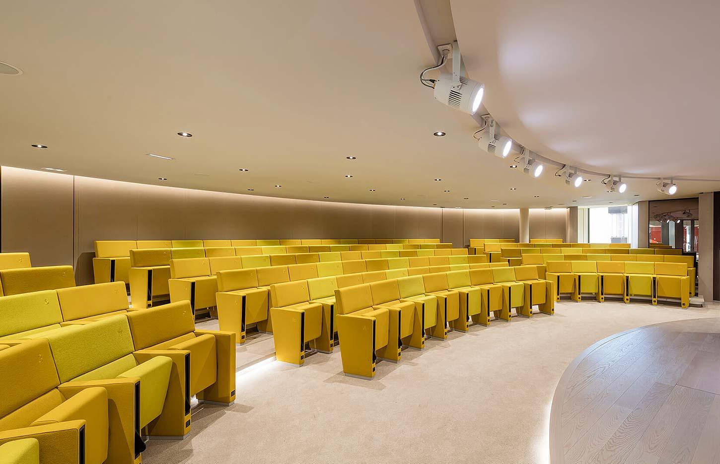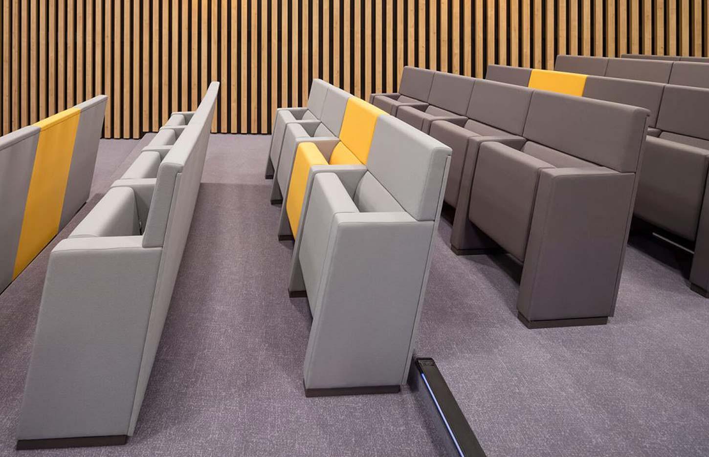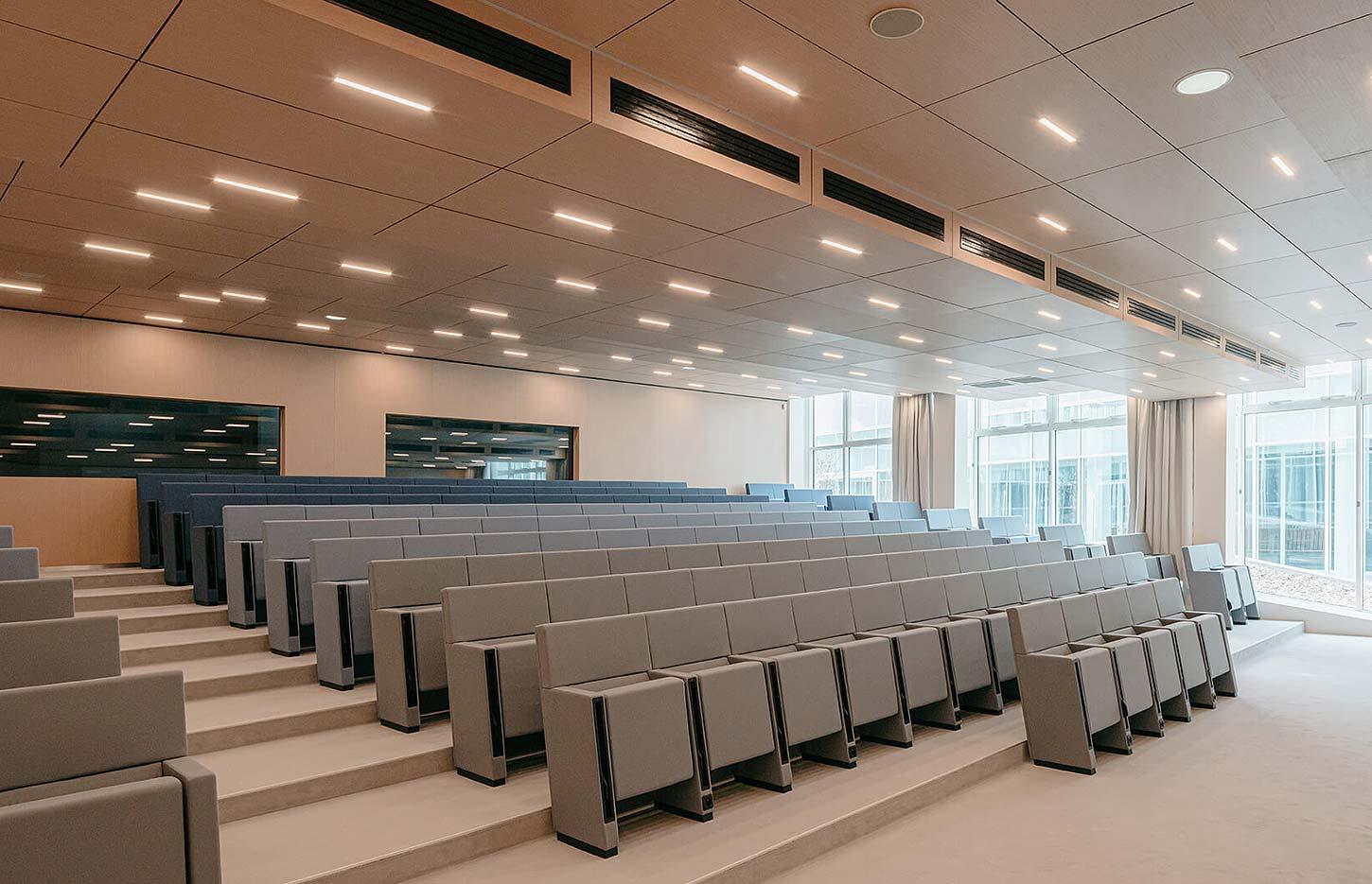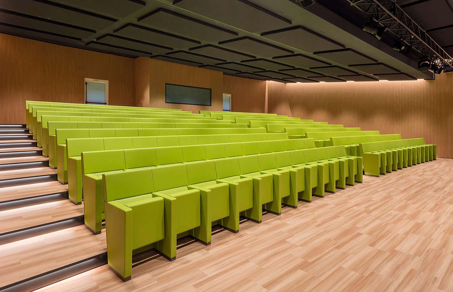 La gamme Gadoni est conçu pour répondre aux besoins des auditoriums, salles de conférence, amphithéâtres et espaces polyvalents. Son design linéaire et épuré lui permet de s’intégrer avec élégance dans des environnements variés, tout en offrant une esthétique soignée aussi bien de face que de dos. L’assise est équipée d’un mécanisme de relevage par gravité, garantissant un mouvement fluide, silencieux et durable. Le dossier, doté d’une structure interne en multiplis et d’un rembourrage en mousse de polyuréthane ignifuge et indéformable, offre un excellent confort d’assise. Le panneau arrière du dossier peut être en bois apparent ou entièrement rembourré et revêtu selon les besoins du projet. Les flancs porteurs existent en version droite ou inclinée, avec une structure interne métallique intégrée dans un caisson, entièrement rembourré et habillé de tissu, cuir, cuir écologique ou bois verni. Une version en bois intégral est également disponible. Le fauteuil se fixe au sol par un pied en acier peint, permettant l’installation sur sol plat, incliné ou en gradins, et la mise en place en rangées droites ou en arc de cercle. La technologie Floor Technology est disponible en option : elle permet d’escamoter complètement le siège sous le plancher afin de libérer l’espace en quelques instants, idéale pour les salles polyvalentes ou modulaires. De nombreux accessoires complètent la gamme : tablette d’écriture rabattable et escamotable, numérotation des sièges et rangées, panneau arrière bois, accoudoirs variés, intégration de prises électriques, et autres options destinées à personnaliser chaque installation.