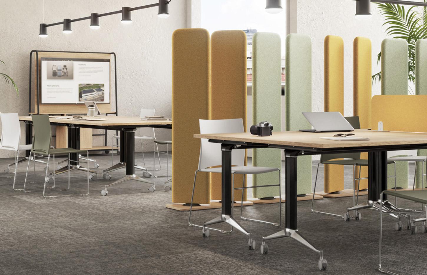 Créer de multiples combinaisons grâce à la mobilité et aux différentes formes qu’offre la gamme Maurici. Ses roulettes freinées permettent de les déplacer facilement puis de les installer en toute sécurité. Son plateau abattant réduit considérablement l’espace occupé lors de leurs stockages.