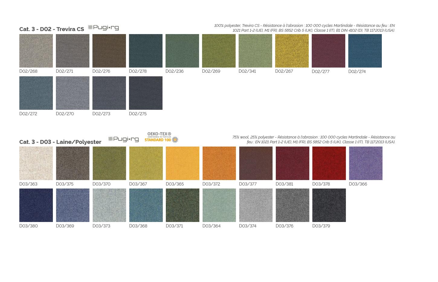 | 100% polyester FR - Trevira CS Martindale: 100.000 cycles ± 20% Reaction to fire: EN 1021 Part 1-2 (UE), Classe 1 (IT), BS 5852 Crib 5 (UK), M1 (FR), B1 DIN 4102 (D), TB 117:2013 (USA) |
