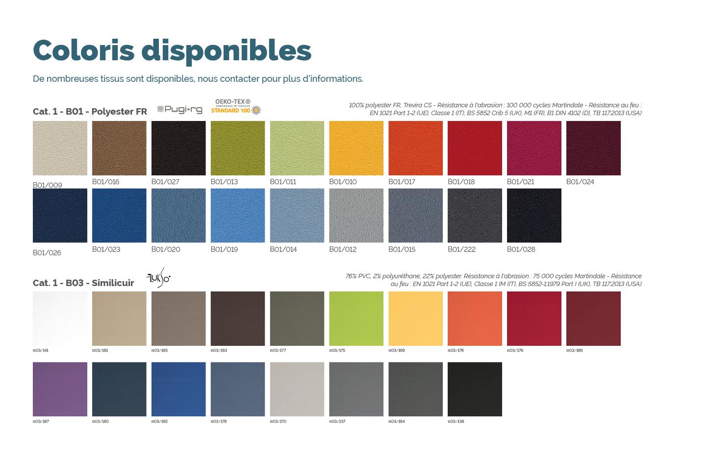100% polyester FR - Trevira CS - Martindale: 100.000 cycles - Reaction to fire: EN 1021 Part 1-2 (UE) M1 (FR), BS 5852 Crib 5 (UK), Classe 1 (IT), B1 DIN 4102 (D), TB 117:2013 (USA) |