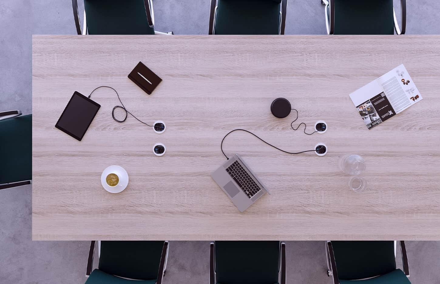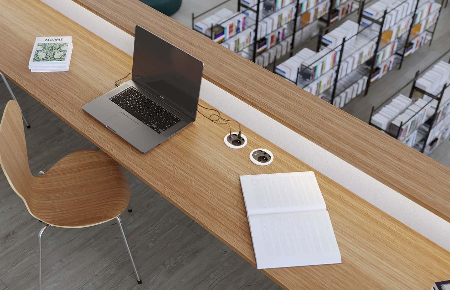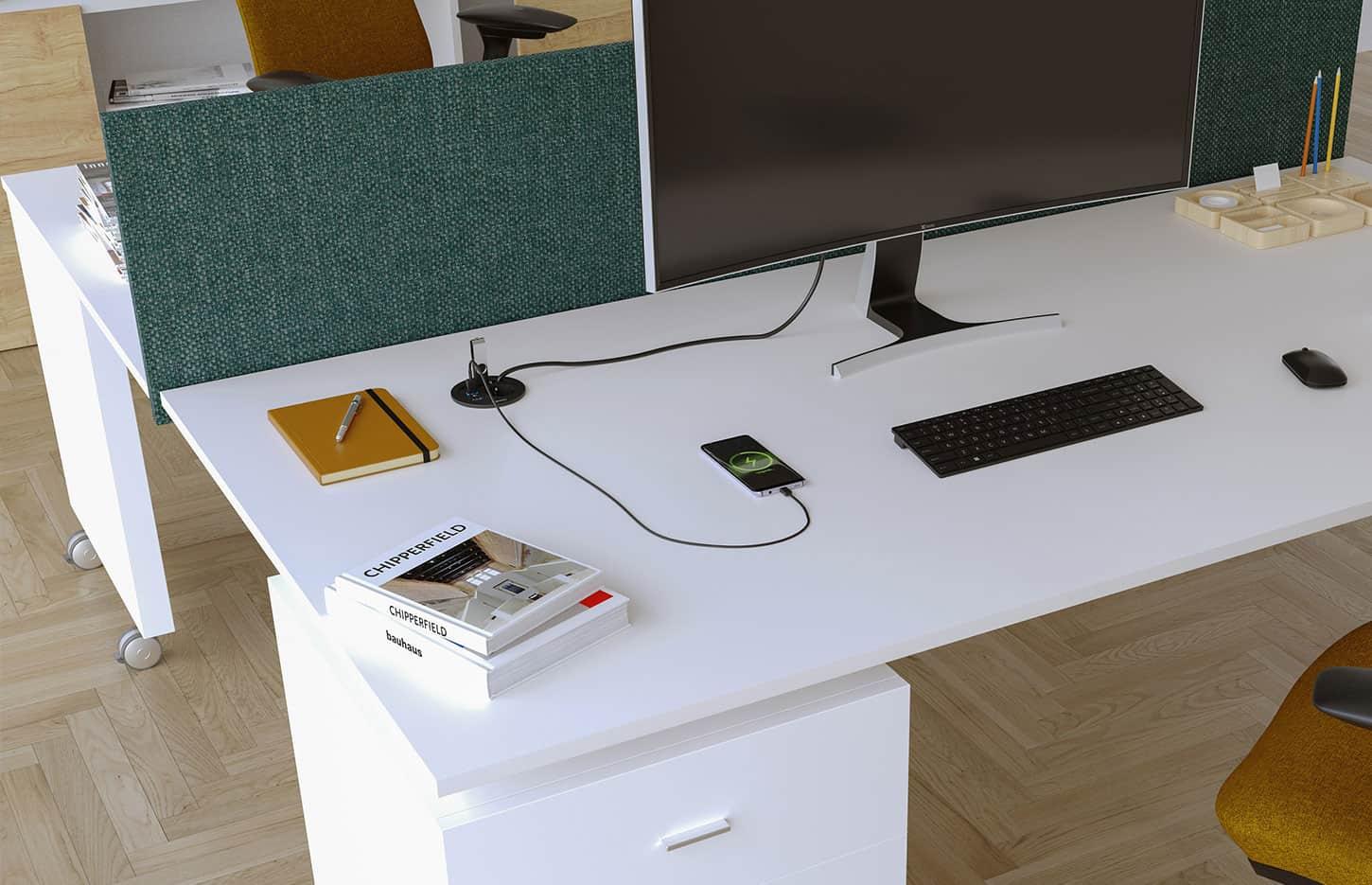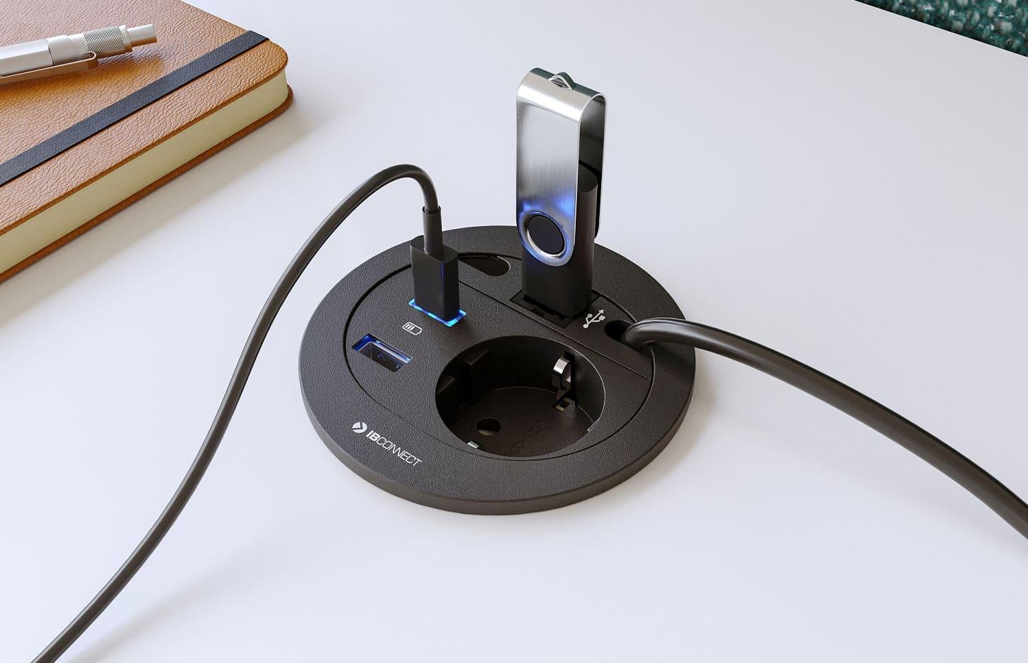 La gamme Point de connexion propose des solutions compactes et élégantes pour intégrer prises électriques, USB et connecteurs multimédia directement dans le mobilier. Disponible en différents formats (60 mm ou 80 mm), elle s’adapte aussi bien aux petits espaces qu’aux configurations plus complètes avec passe-câbles et modules réseau. Grâce à la charge rapide USB-C jusqu’à 60 W, elle répond aux besoins des appareils modernes. Facile à installer et proposée en finitions blanc ou noir, elle combine praticité et discrétion. Ces points de connexion sont idéals pour les bureaux contemporains, salles de réunion et espaces collaboratifs.