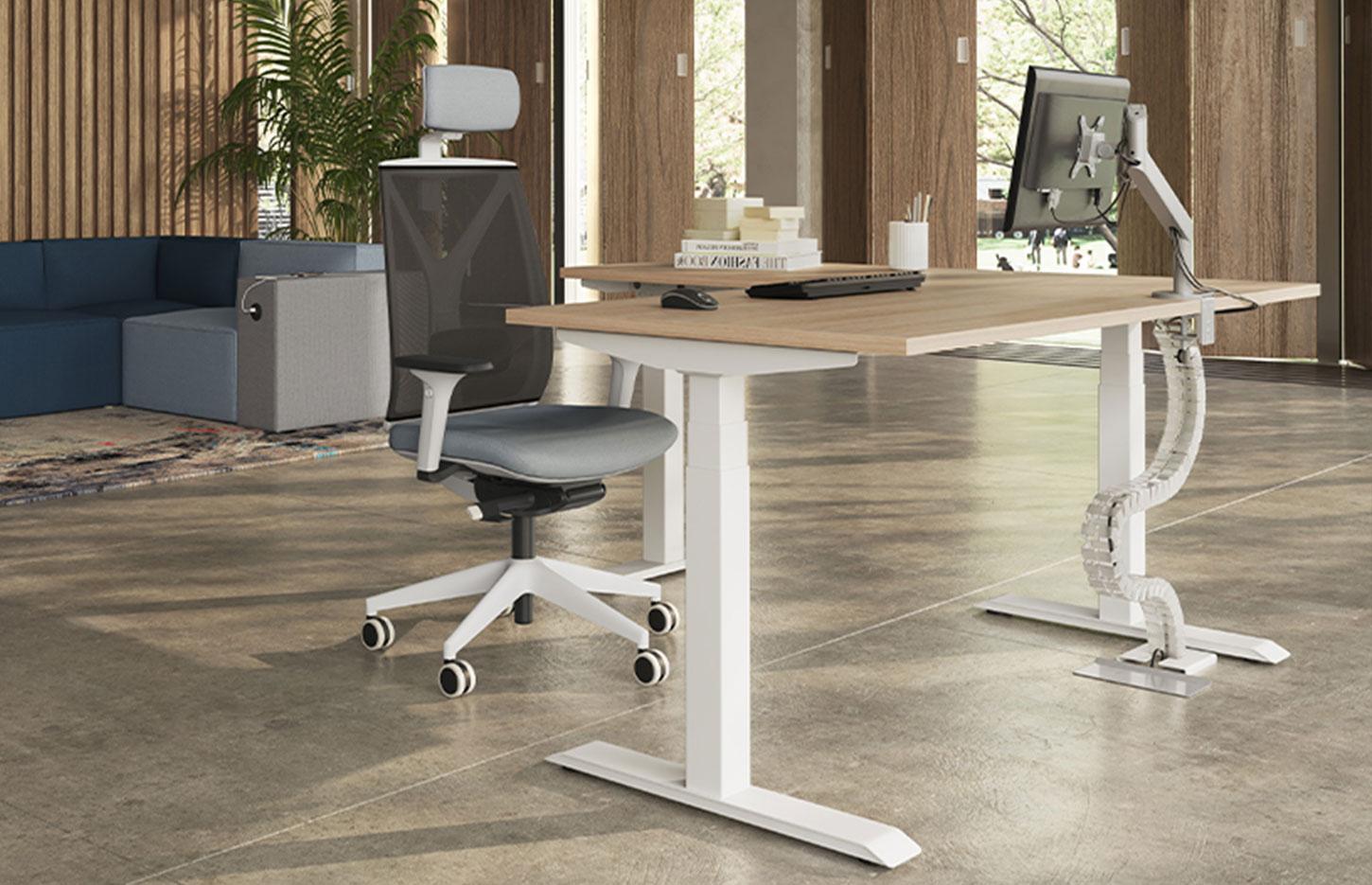 Sous le plateau, partie centrale, il y a une boîte électrique pour deux colonnes. Consommation standby <0.1W. Tension d’entrée: 100 - 230 V. Mouvement synchronisé des colonnes avec actionneur automatique anti-collision. Structure supérieure: cadre en forme de H, réalisé par un tube rectangulaire d’acier 40x20 mm de 2 mm d’épaisseur et un autre tube rectangulaire de 30x14 mm de 1,5 mm d’épaisseur. La partie supérieure de la colonne est constituée d’une tôle en acier en forme de “L” de 3 mm d’épaisseur. La partie inférieur de la colonne est constituée vérins de réglage en PP filetage métrique 8. Renforts en tube d’acier rectangulaire 80x50 mm et 2 mm d’épaisseur. Les supports (pinces) pour les cloisonnettes sont pré-montés sur les renforts. Ces pinces sont réglables pour placer des panneaux de différentes épaisseurs. L’ensemble de 2 bureaux comprend une double goulotte télescopique pour câbles, fabriquée en tôle laminée à froid d’acier de 1,2 mm d’épaisseur.